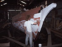 Painting the bow during the refit, Tasmania, 1993. (Copyright Peter Malcolm.)