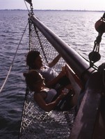 Natalie (top) and Narelle relaxing in the bow-net. (Copyright Peter Malcolm.)