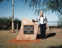 Pam Nielsen with the memorial to Captain Gregory, near the old jetty site,